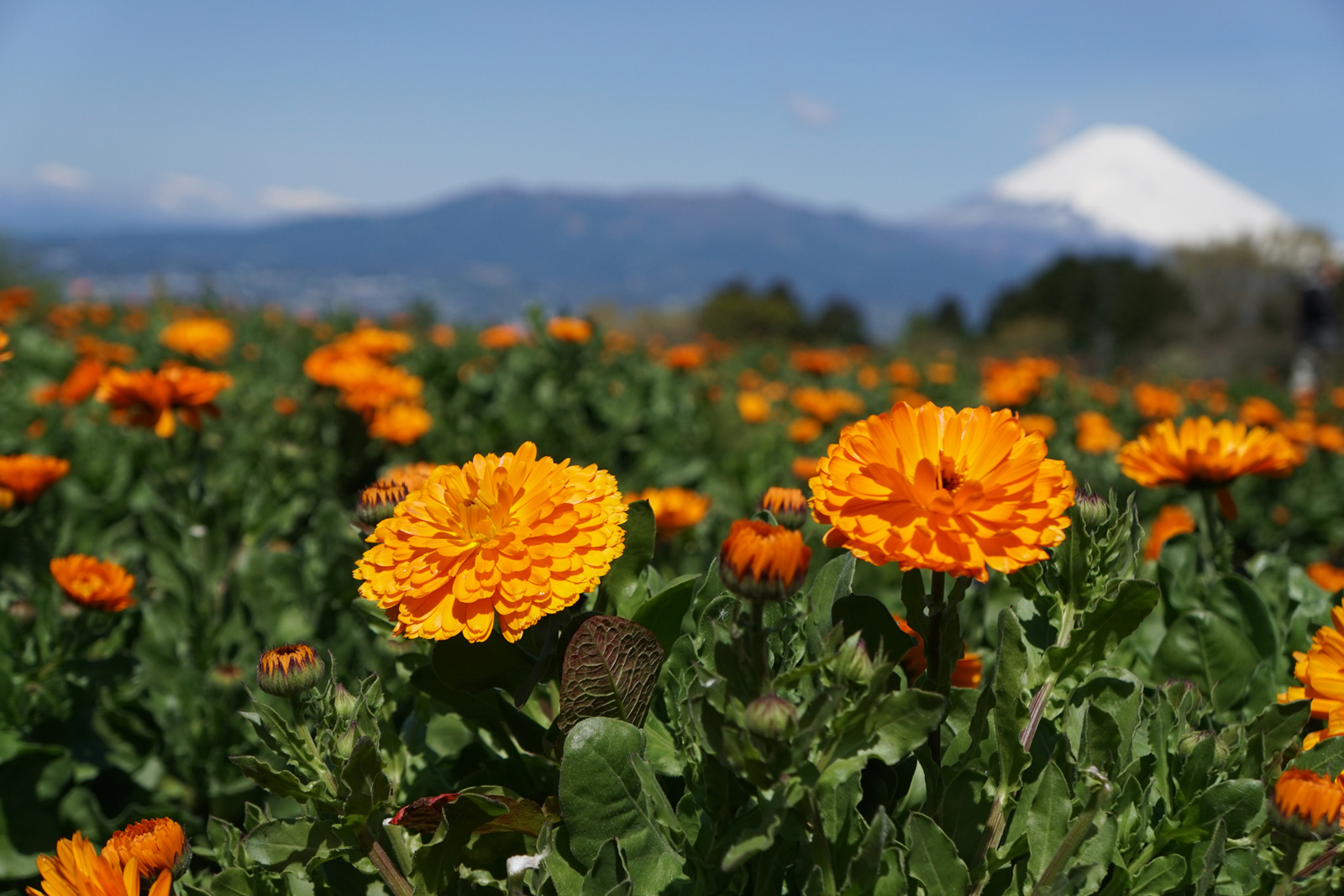 ▲静岡県の豊受自然農場 カレンデュラ畑と富士山